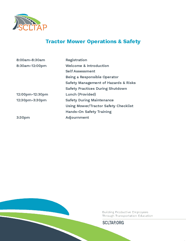This class is designed to educate tractor/mower operators in safe operation of their equipment, right-of-way mowers. The course includes facilitated class room training, a working lunch, and hands-on-equipment training. Safety management of hazards and risks will be discussed and demonstrated. Operations safety training will consist of mounting, dismounting, equipment inspection, proper signage, proper use of personal protection equipment (PPE), and a short driving course. Each participant will receive work gloves, ear plugs, and safety glasses.